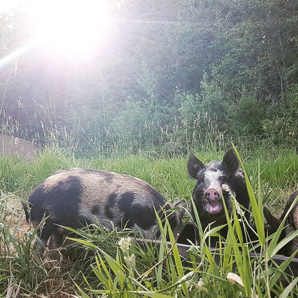 We raise a small number of pigs every year. They are raised on pasture with access to shelter when they need it. We feed them a grain based pellet, and through the spring a summer their diet is supplemented with veggies from our greenhouse, squash and pumpkins, apples and walnuts.